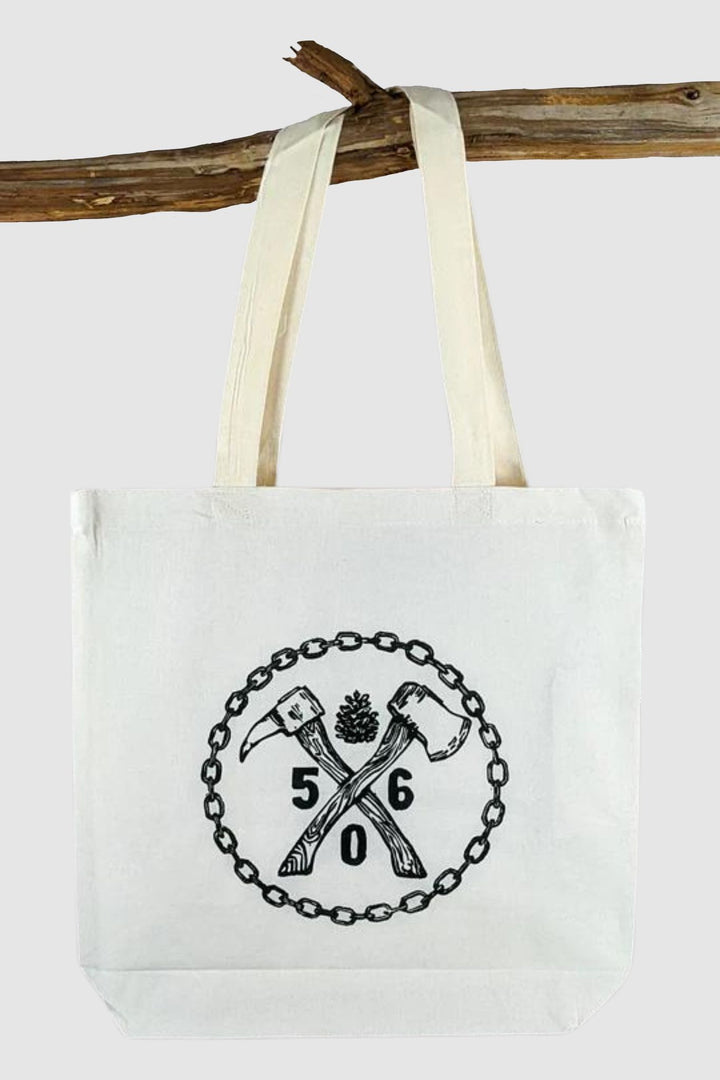 These tote bags are an homage to the hard-working people of our province who aren't afraid to get their hands dirty. Decorated with a fir cone and chain, the axe and picaroon celebrates our 506 heritage!