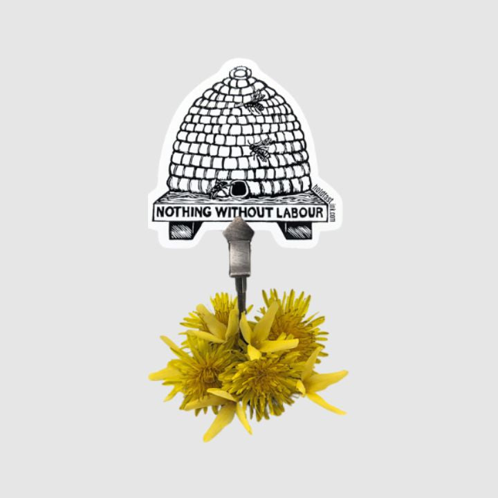 These dome-shaped structures house honeybees and are made from woven straw. Inside, the honeybees work tirelessly to build their hive and produce honey. Our stickers represent solidarity with all you busy bees out there!
