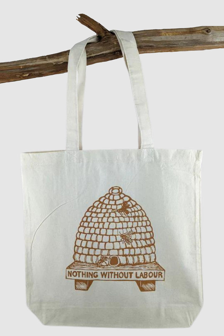 These dome-shaped structures house honeybees and are made from woven straw. Inside, the honeybees work tirelessly to build their hive and produce honey. Our tote bags represent solidarity with all you busy bees out there!