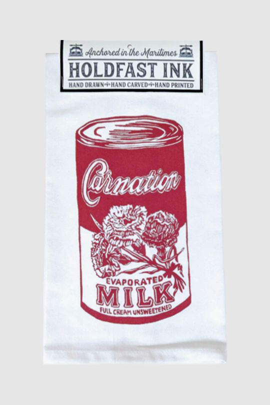Carnation Evaporated Milk is a dairy product made by removing half of the water from milk. It's a shelf-stable canned product, which has made it a favourite of Newfoundlanders for years. Even more shelf-stable still are these tea towels!